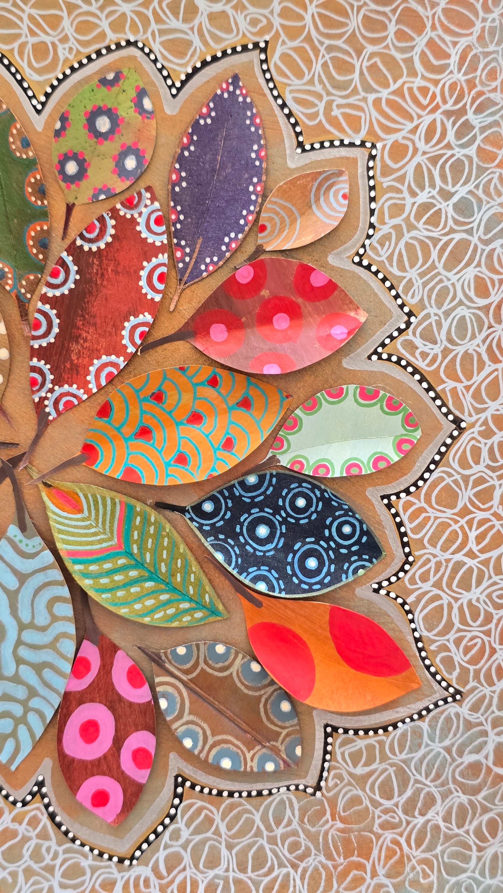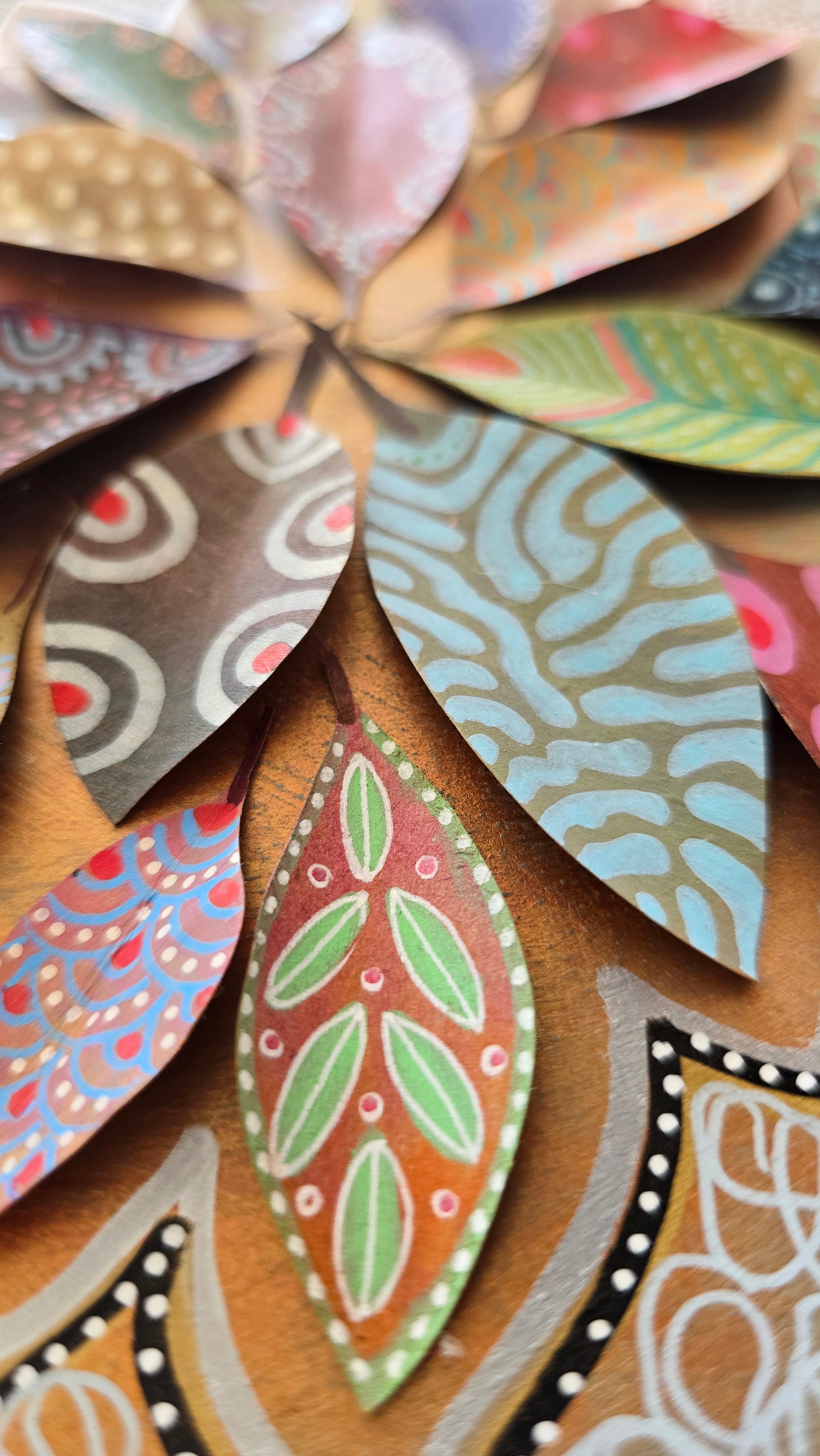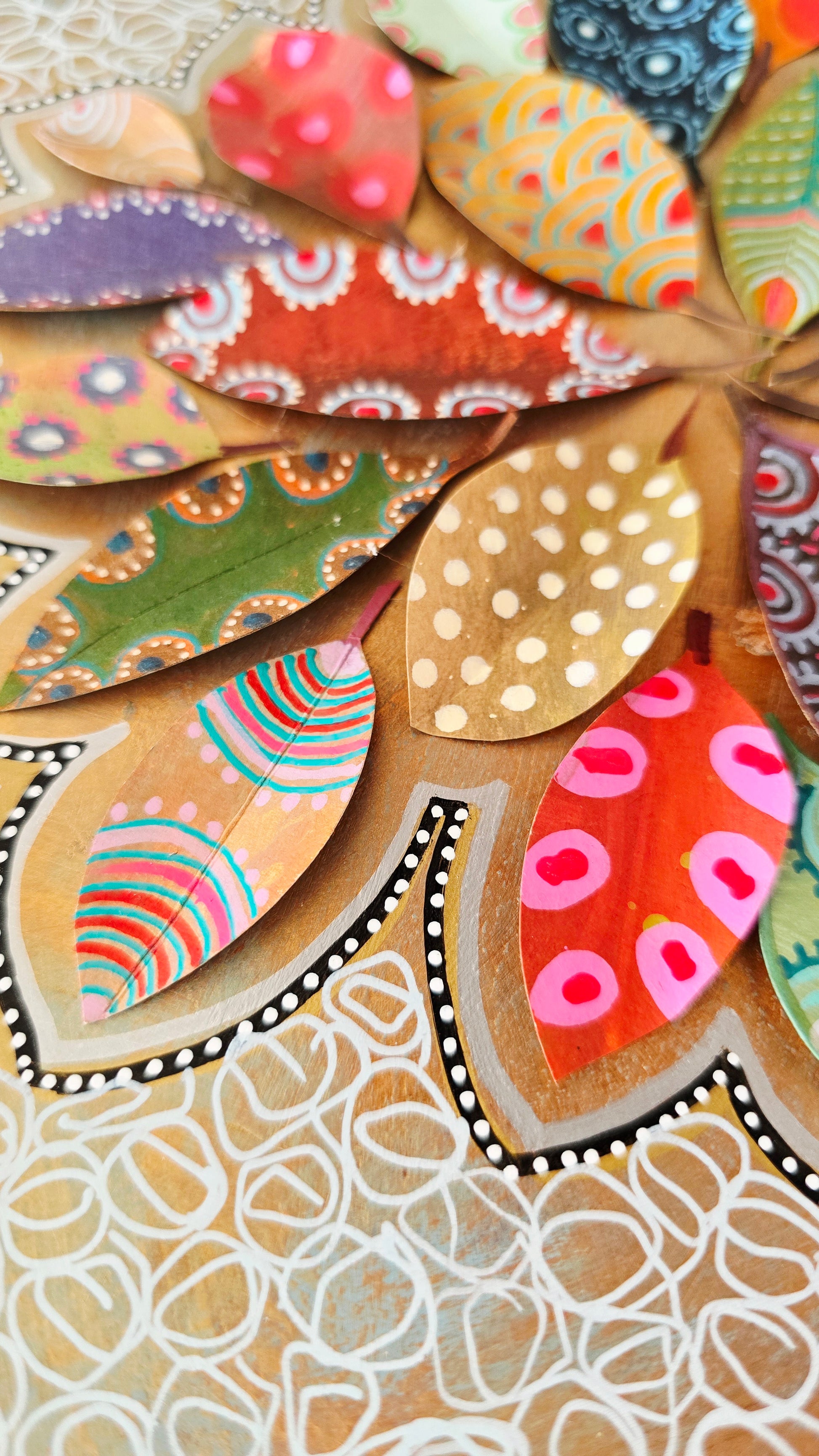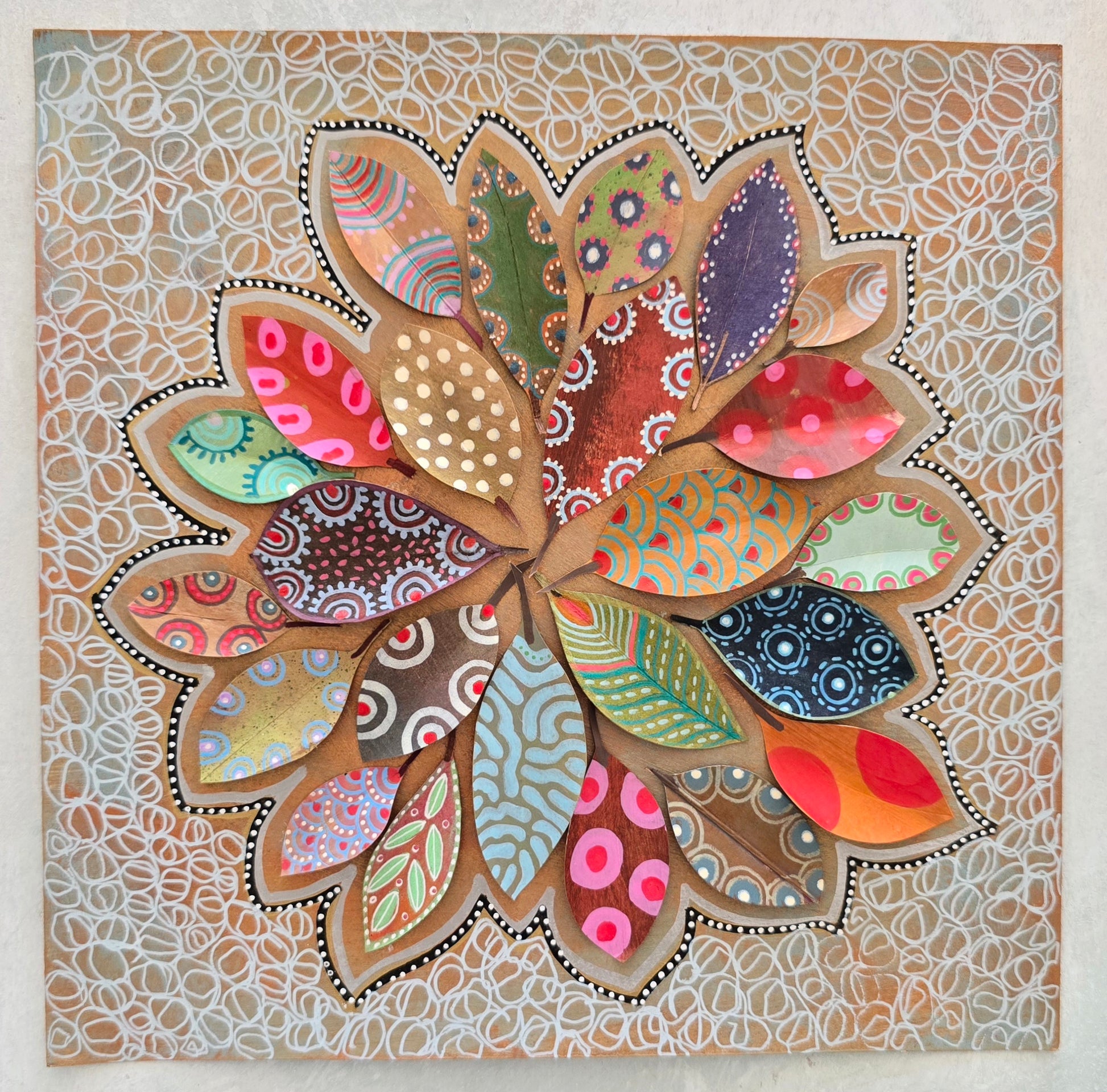 Composición original de 24 hojas de papel formando una estrella, sobre fondo de cartulina cuadrada de 23x23 cm. Cada hoja está decorada a mano con ricos estampados y texturas multicolores inspirados en el arte aborigen.