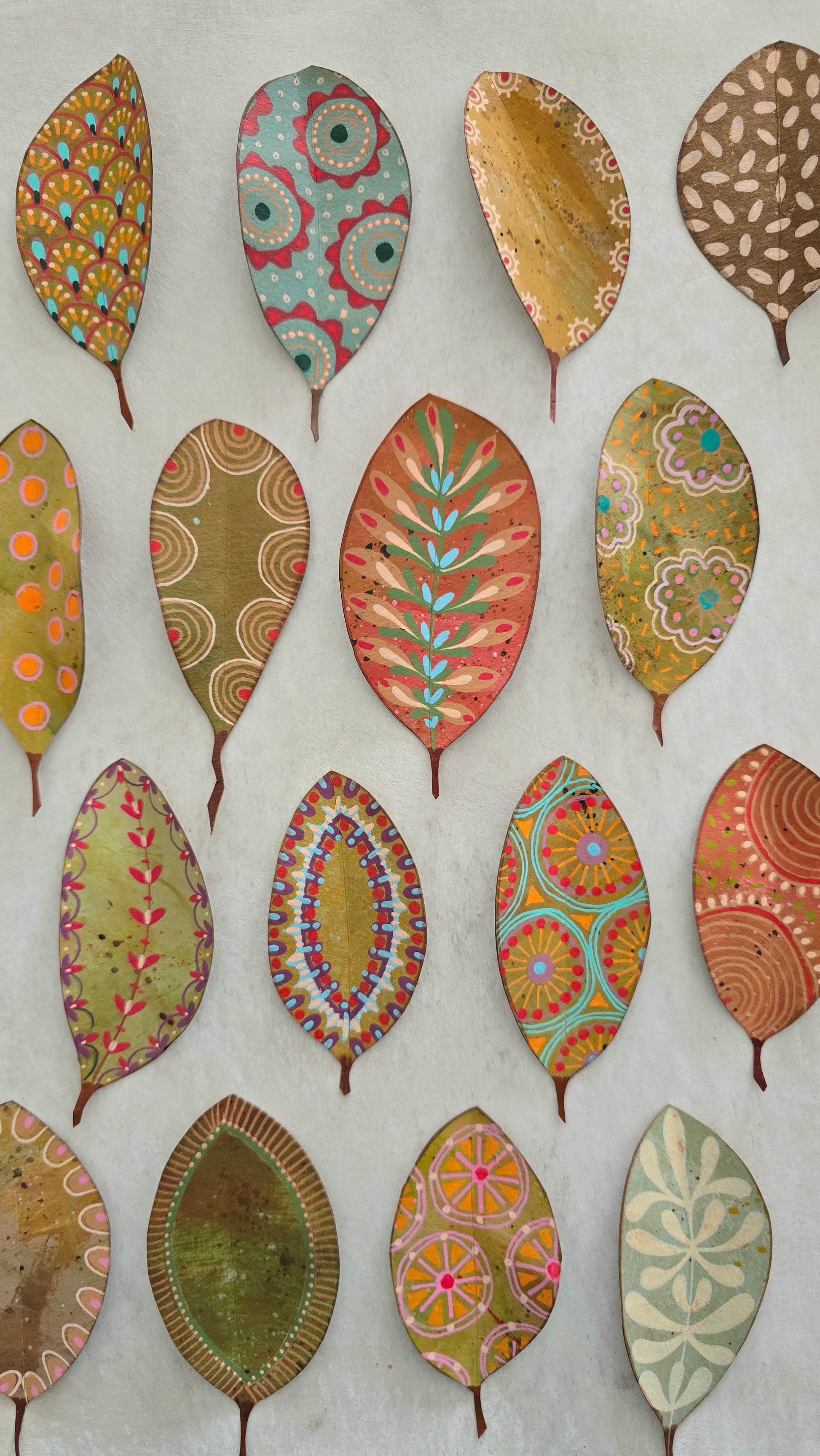 Colección de 16 hojas de papel kraft recortadas y decoradas a mano con ricos estampados y texturas inspirados en el arte aborigen, en tonos de suaves y naturales, sobre fondo color hoja seca, son gruesas de fuerte gramaje 250gr/m y el tamaño oscila entre 8 y 11 cm de altura.
