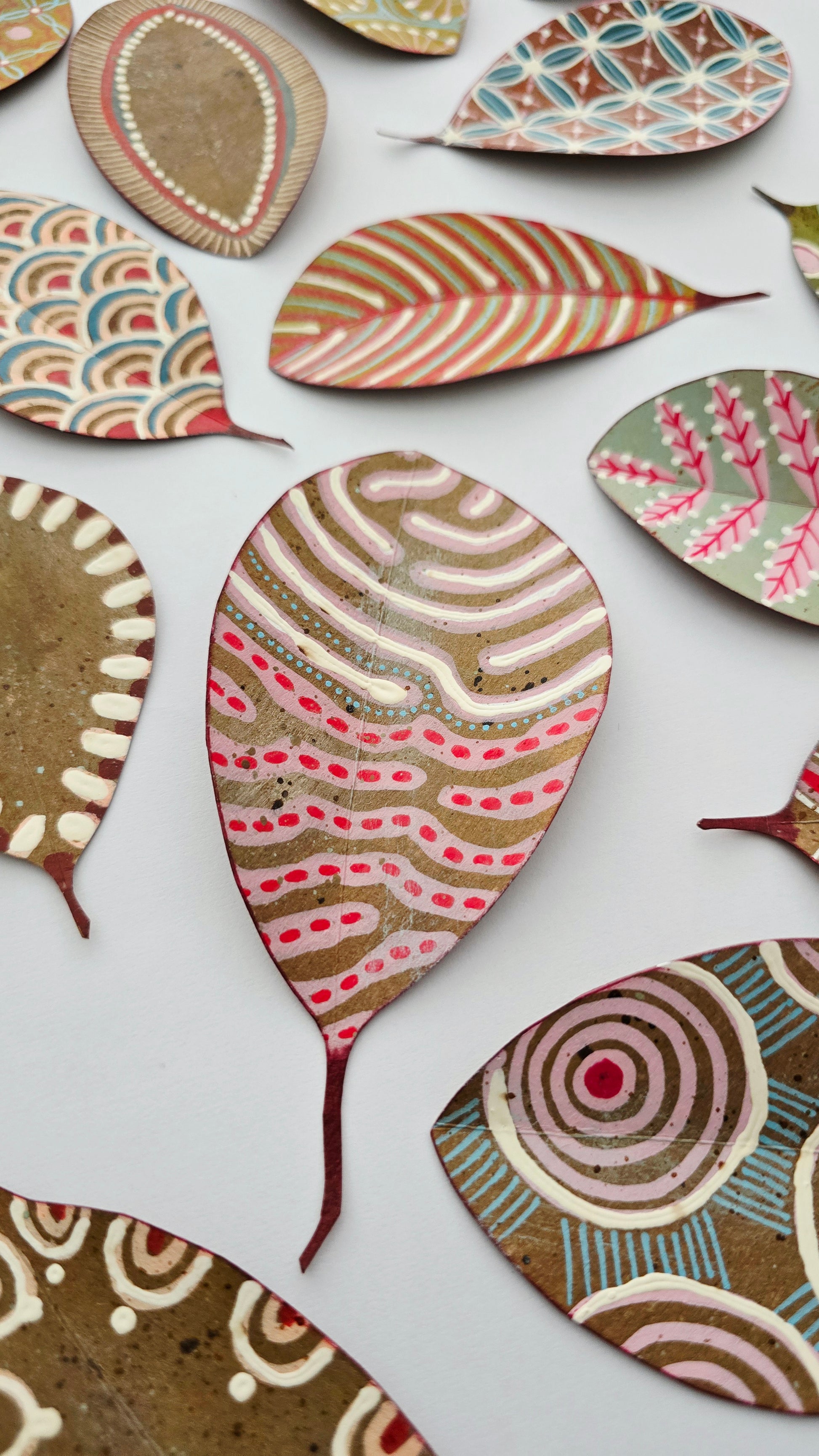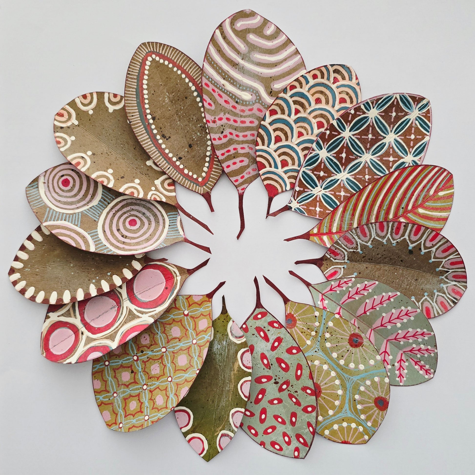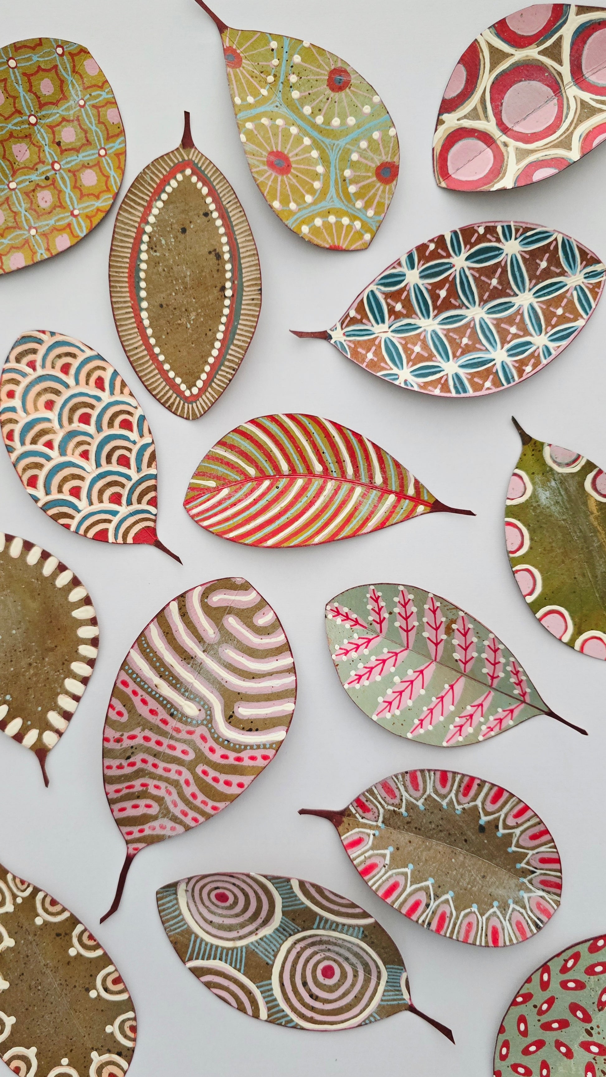 Colección de 15 hojas de papel Kraft, recortadasy pintadas a mano con ricos estampados y texturas inspiradas en el arte aborigen, en tonos pastel. Son gruesas de fuerte gramaje 220 gr/m, miden entre 10 y 12 cms.