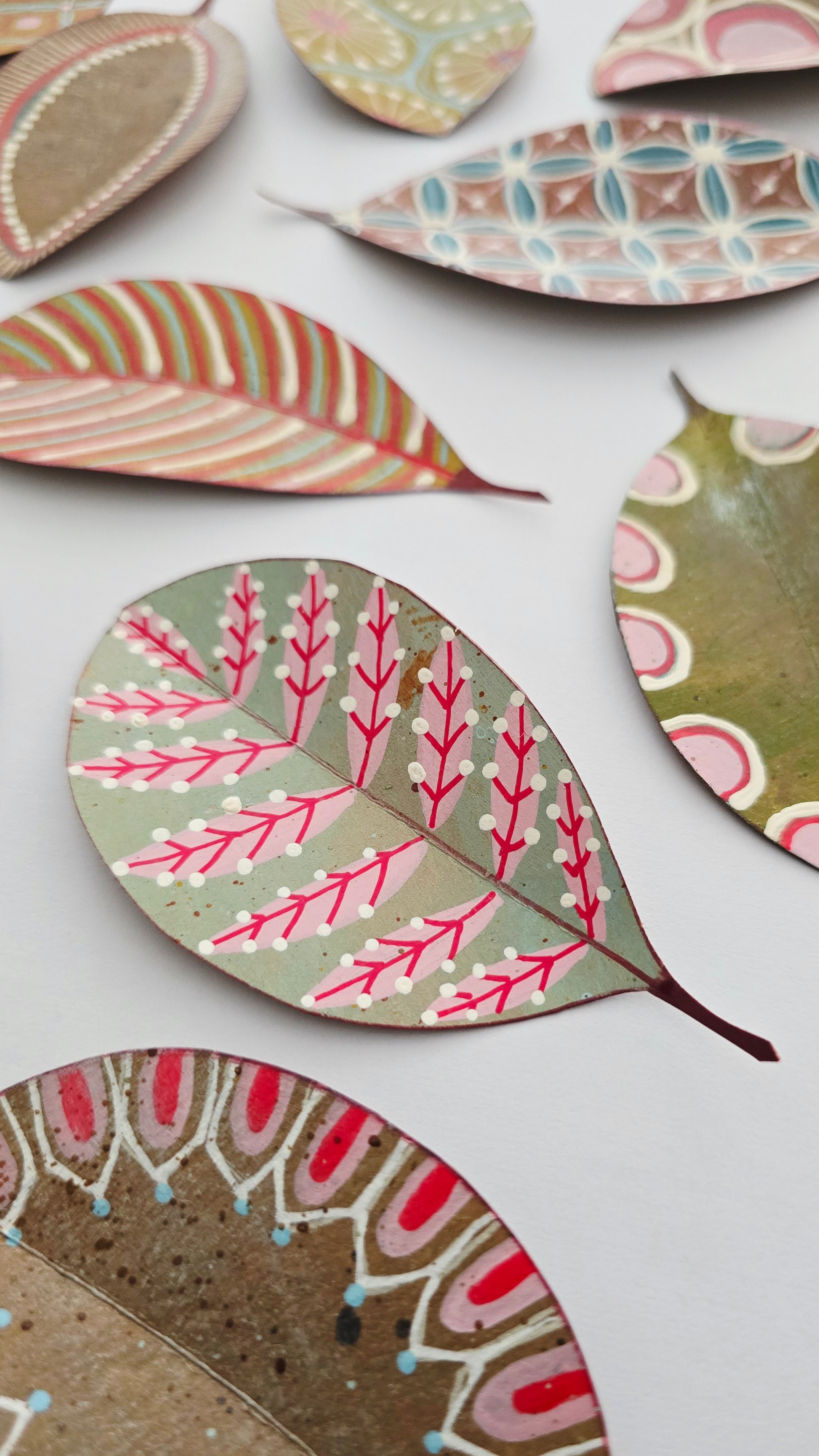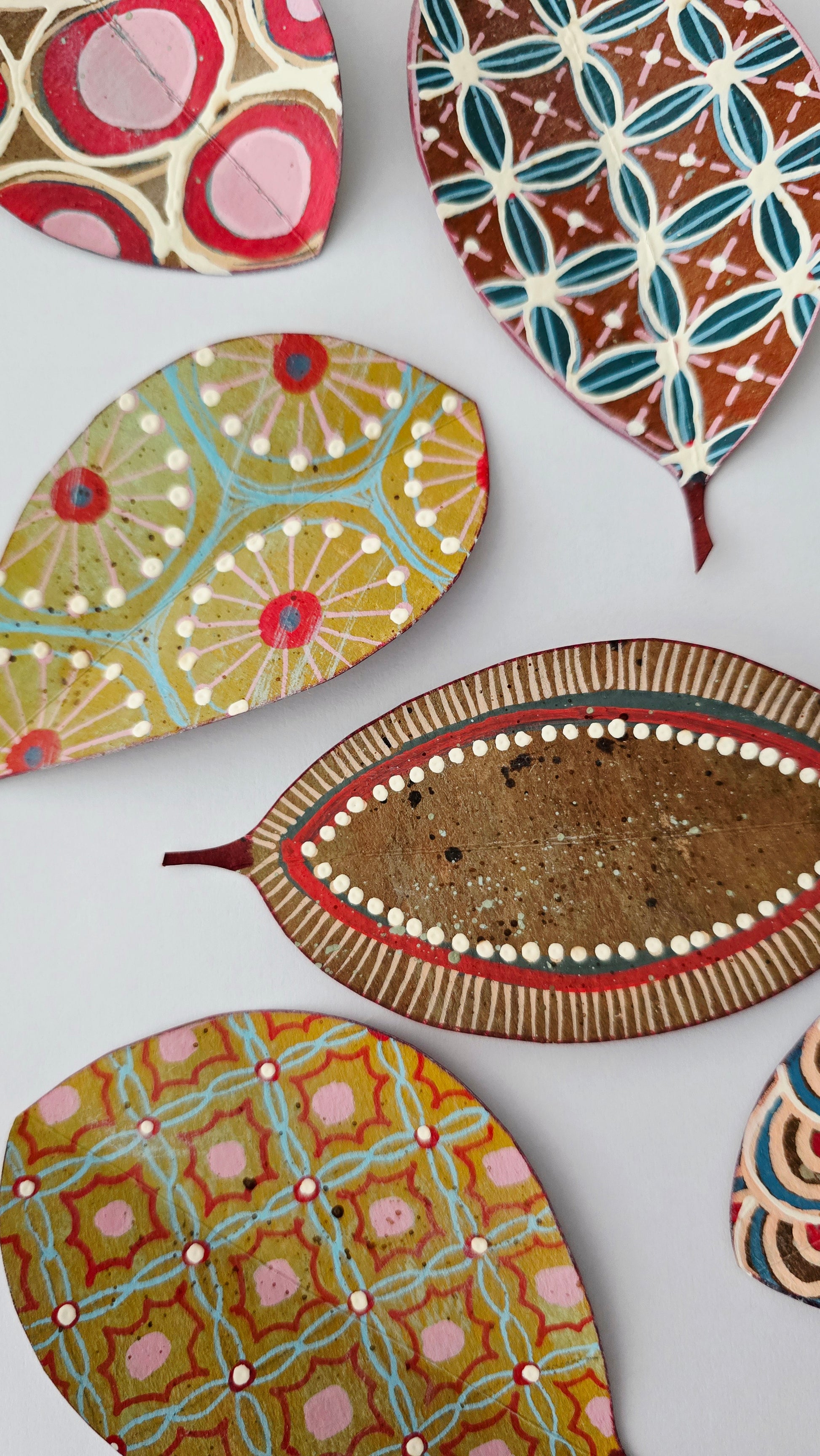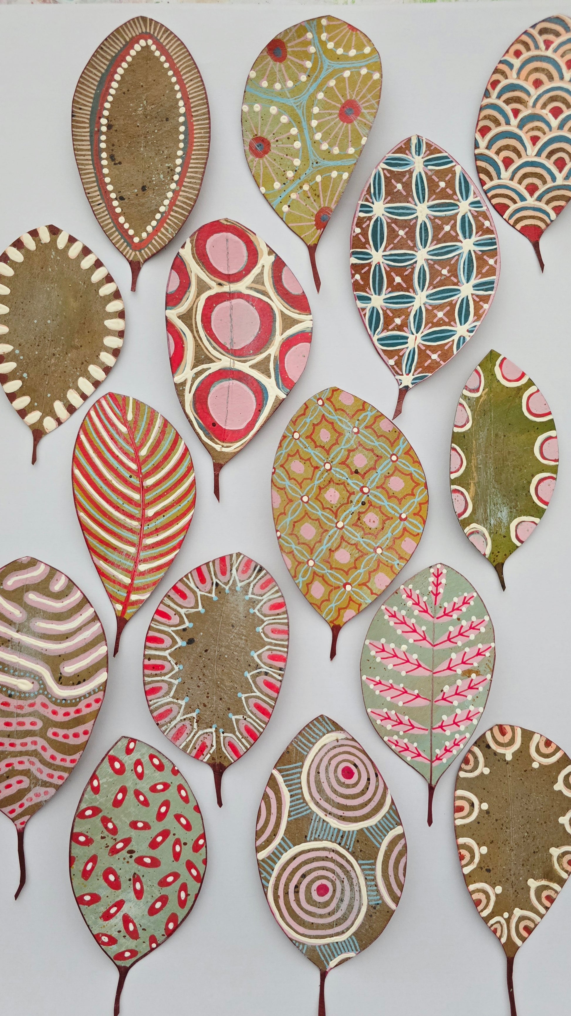 Colección de 15 hojas de papel Kraft, recortadasy pintadas a mano con ricos estampados y texturas inspiradas en el arte aborigen, en tonos pastel. Son gruesas de fuerte gramaje 220 gr/m, miden entre 10 y 12 cms.