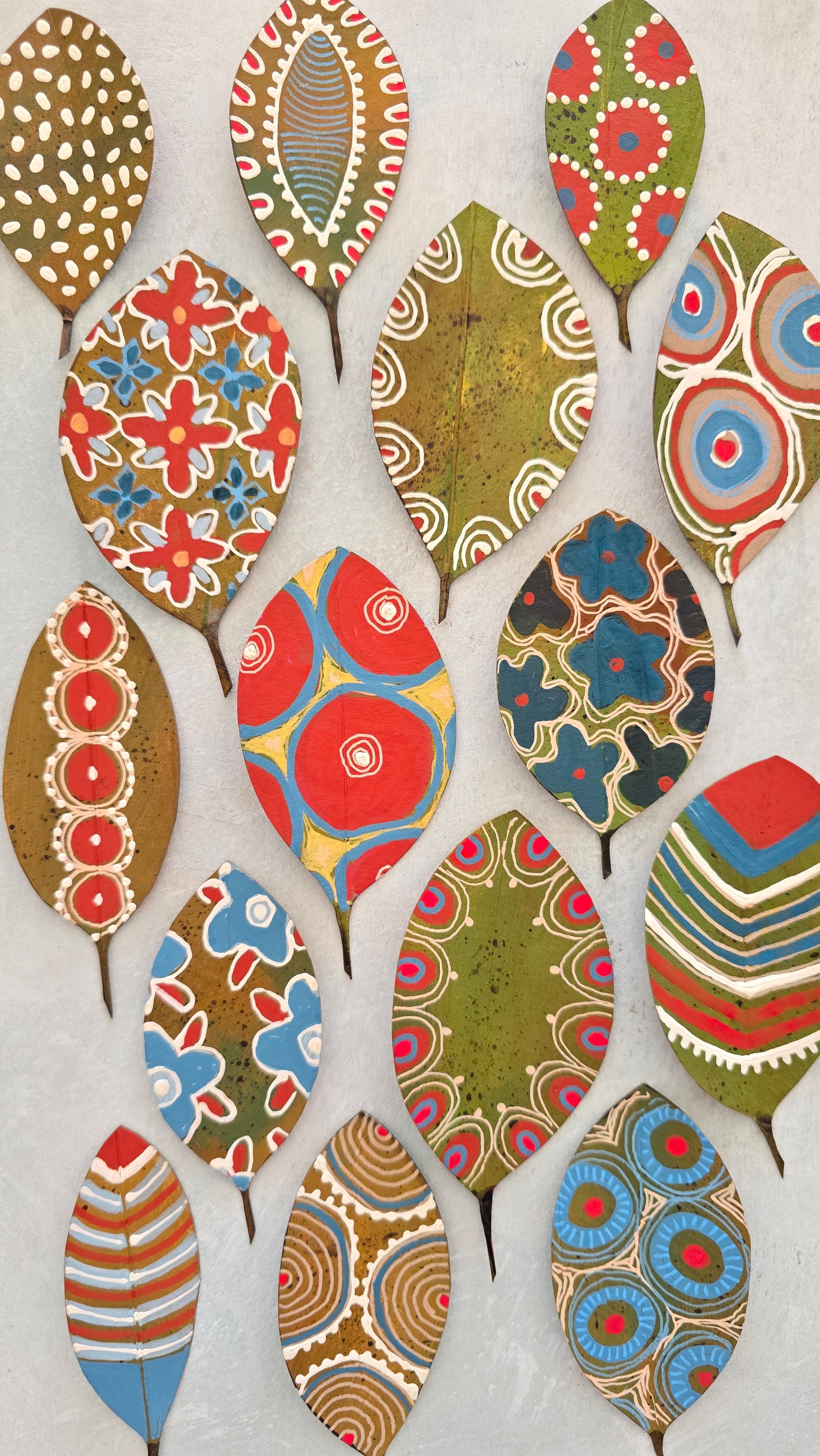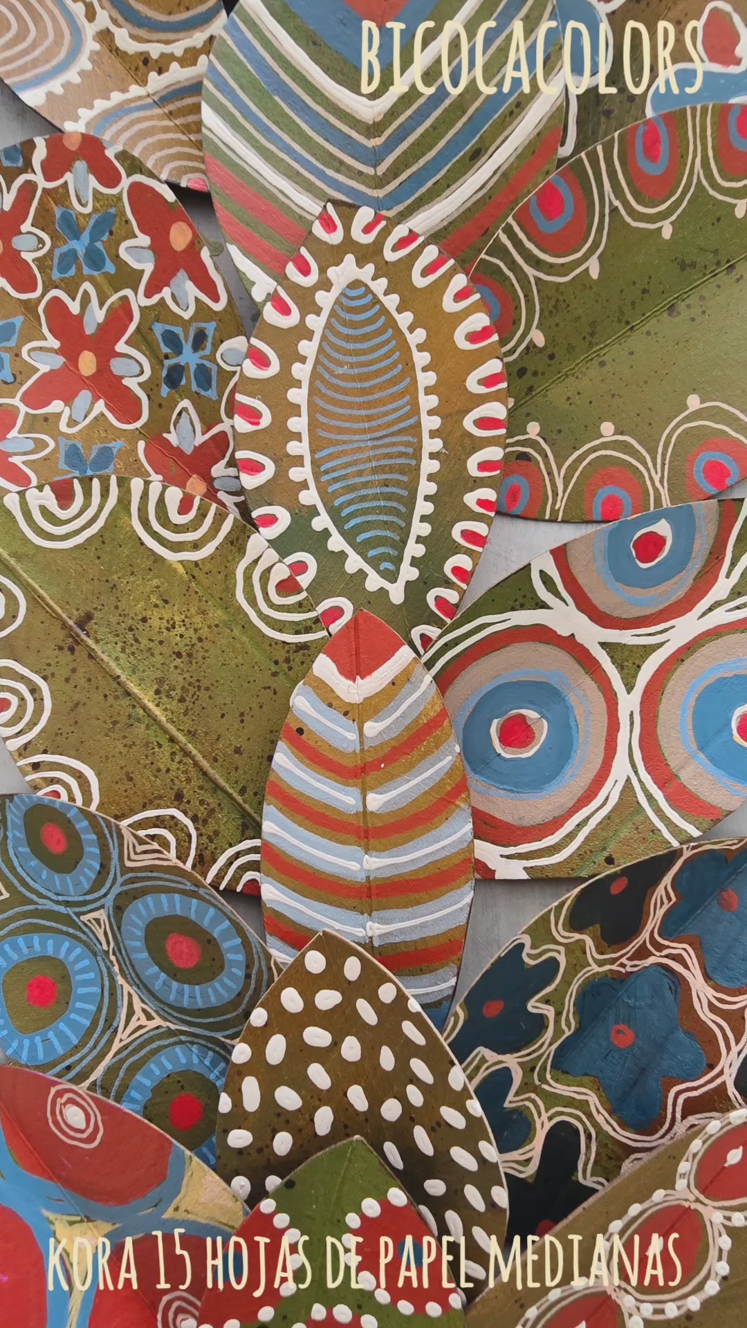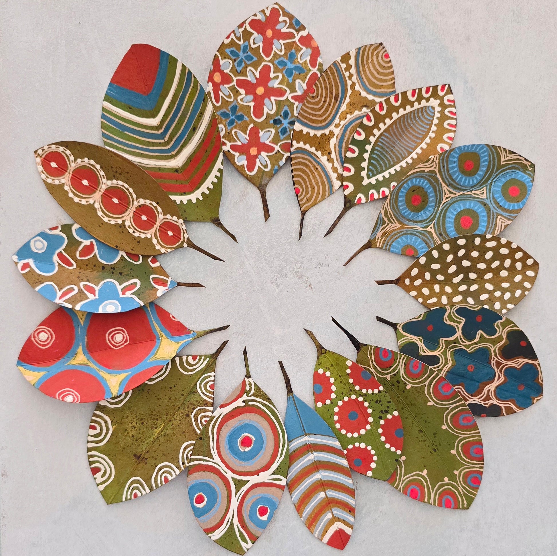 Colección de 15 hojas de papel kraft recortadas y decoradas a mano con ricos estampados y texturas inspirados en el arte aborigen, en tonos de azul, rojo y blanco sobre fondo color hoja seca, son gruesas de fuerte gramaje 250gr/m y el tamaño oscila entre 8 y 11 cm de altura.