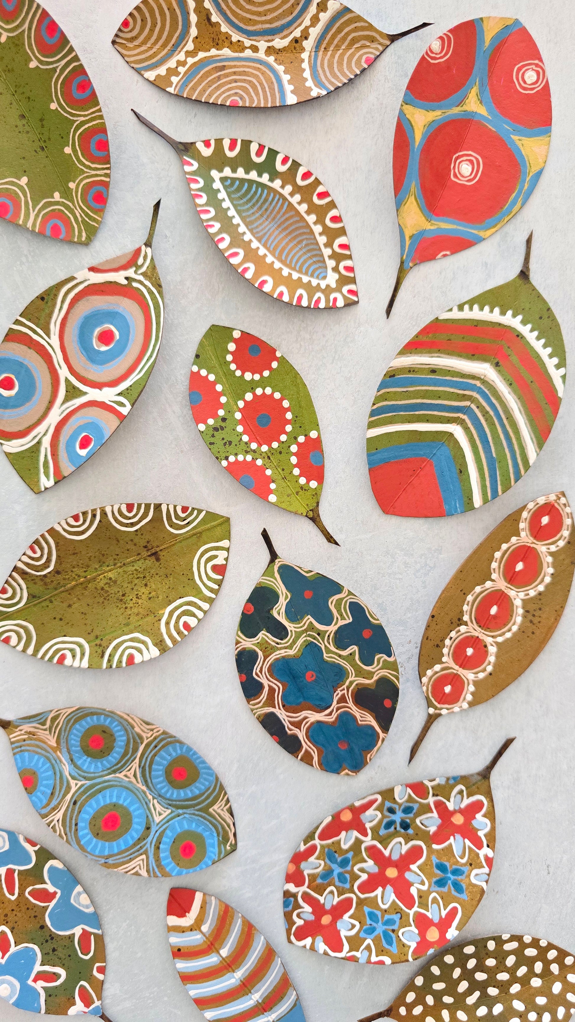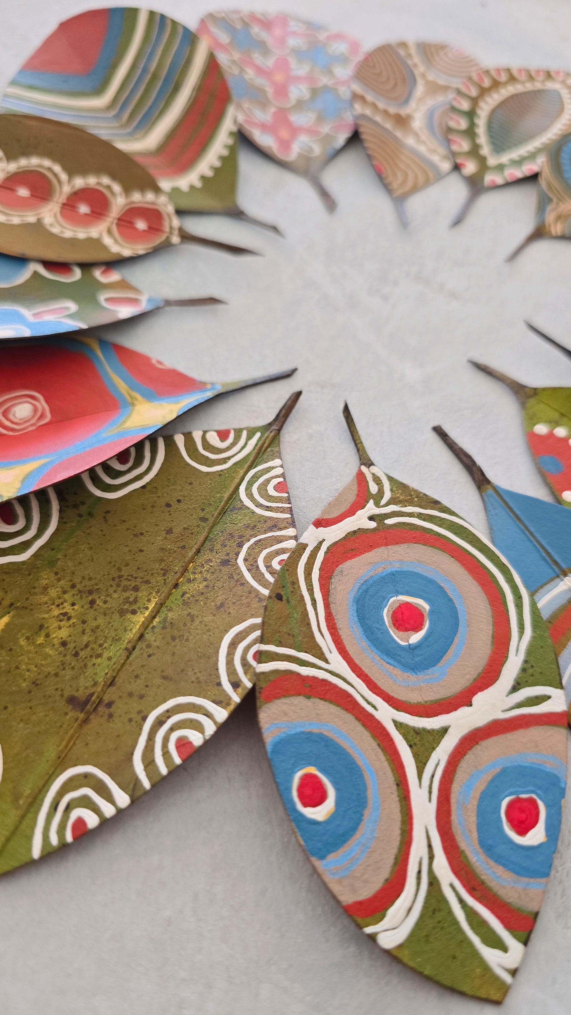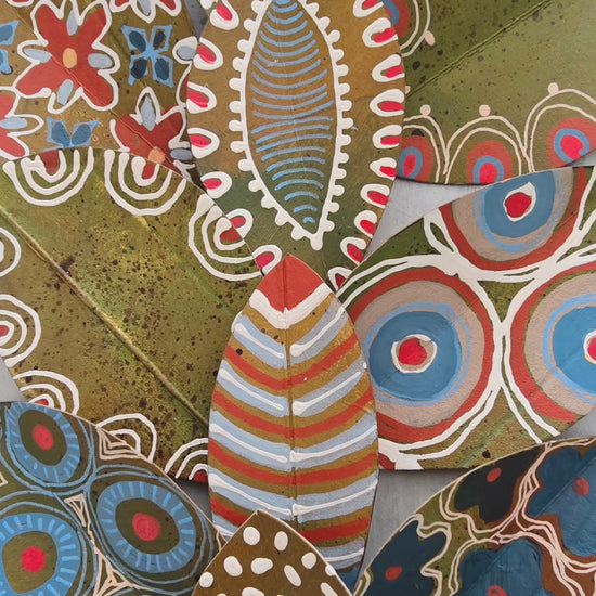 Colección de 15 hojas de papel kraft recortadas y decoradas a mano con ricos estampados y texturas inspirados en el arte aborigen, en tonos de azul, rojo y blanco sobre fondo color hoja seca, son gruesas de fuerte gramaje 250gr/m y el tamaño oscila entre 8 y 11 cm de altura.