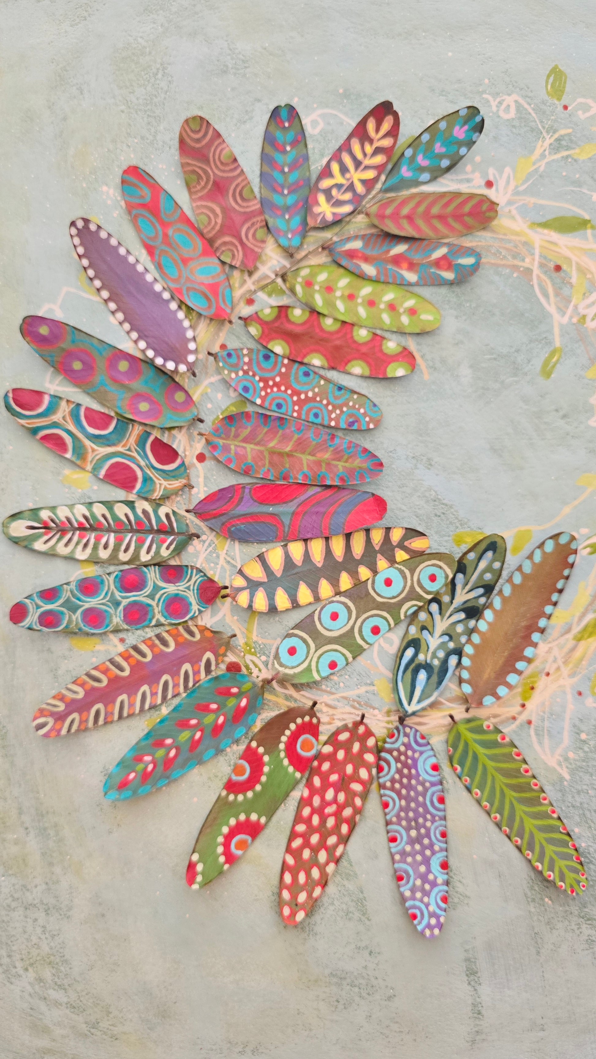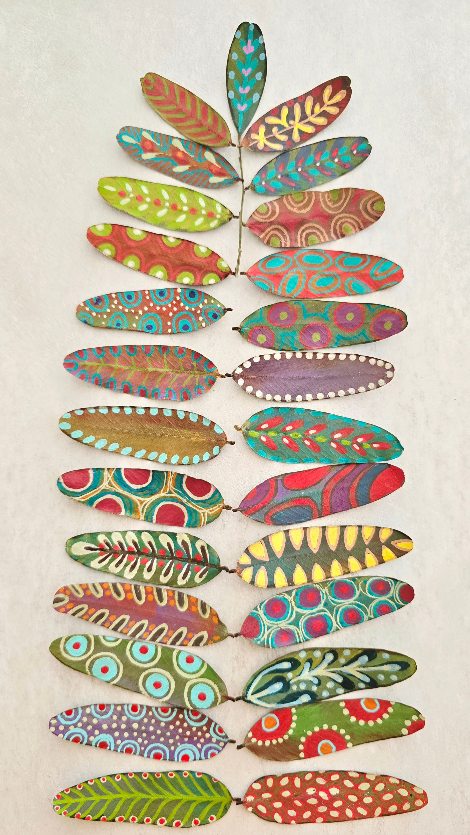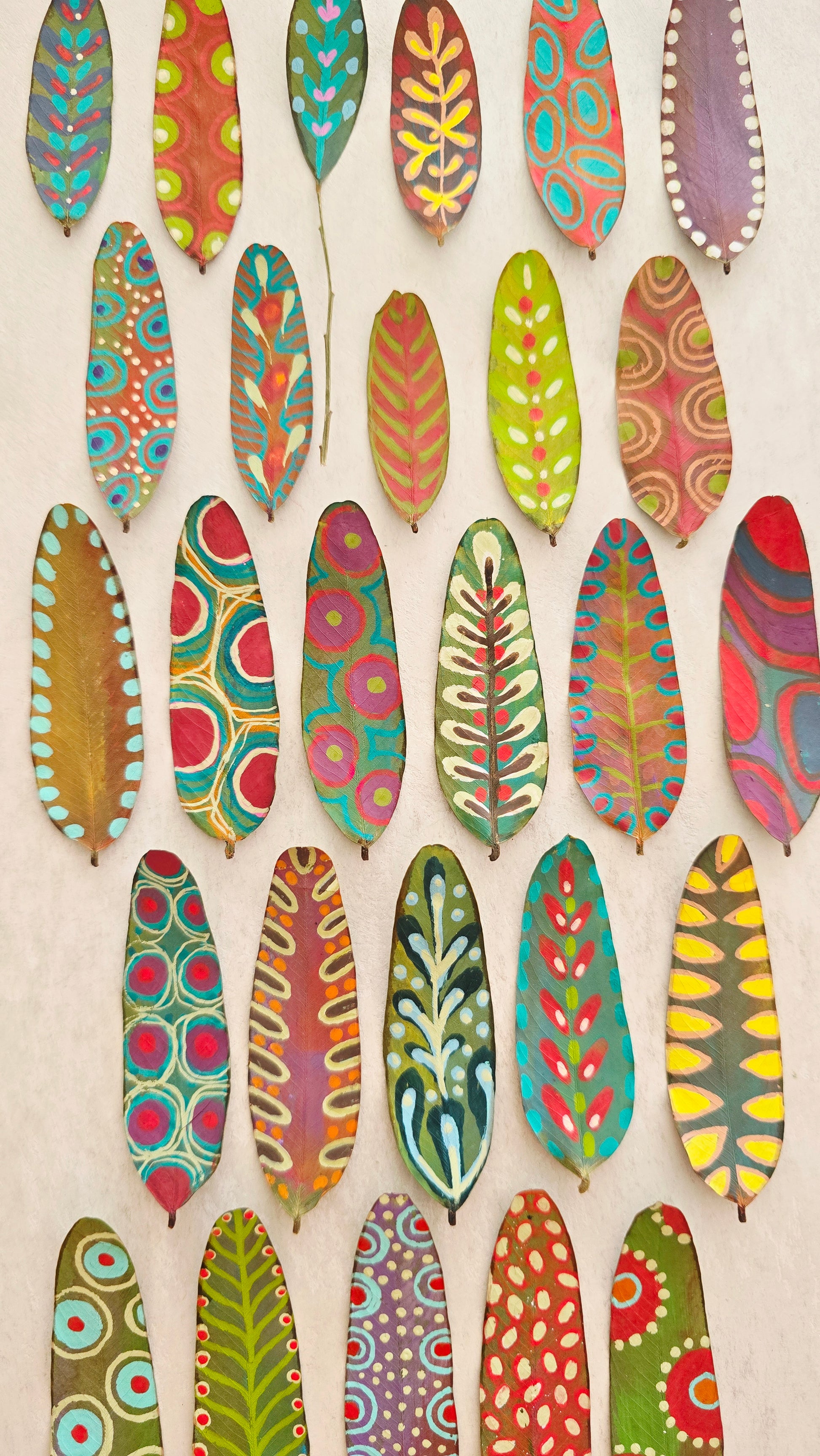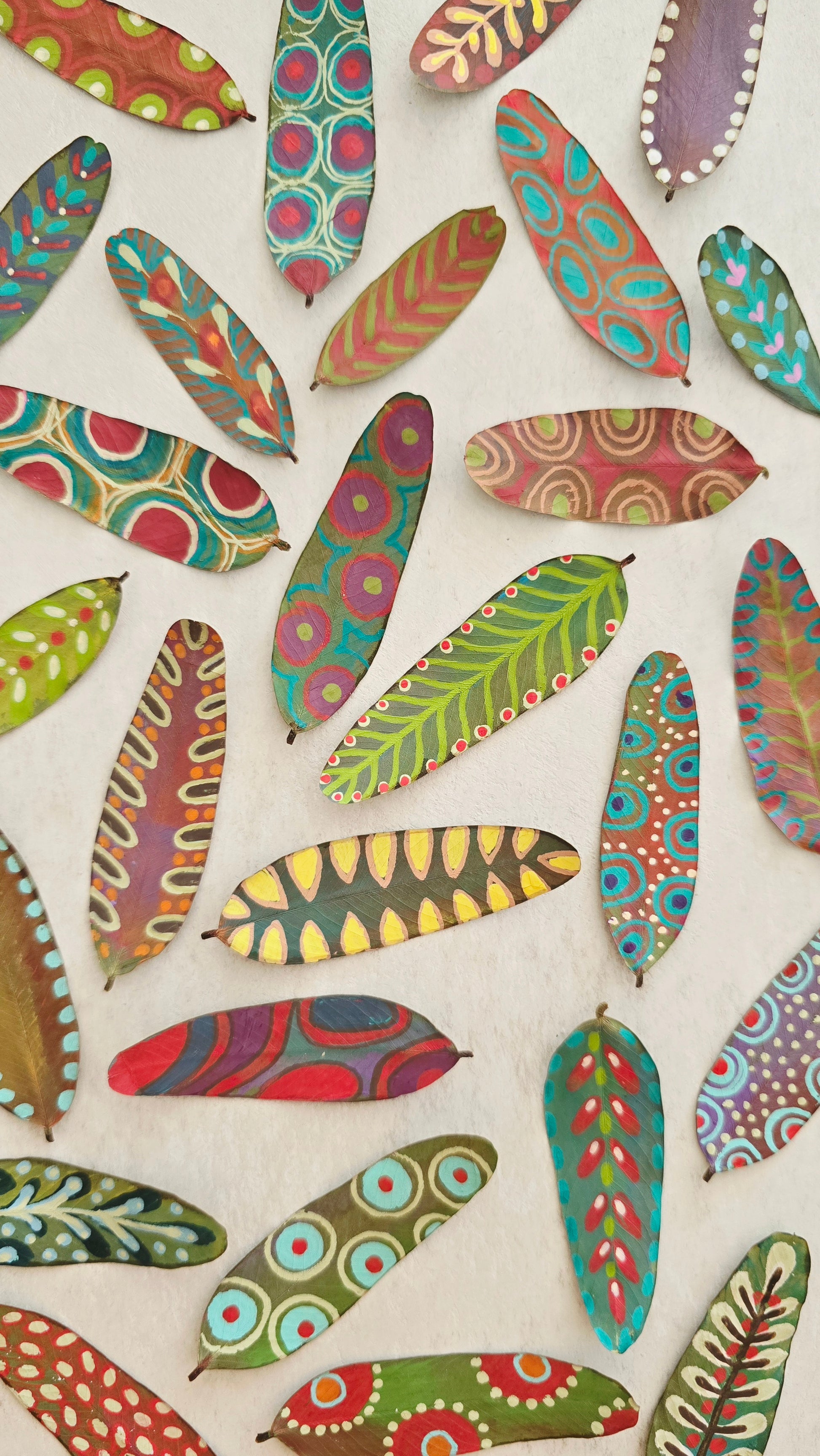 Colección de 27 pequeñas y delicadas hojas de acacia secas, decoradas a mano con ricos estampados y texturas inspirados en el arte aborigen. Son pequeñas y miden entre 4 y 6 cm.