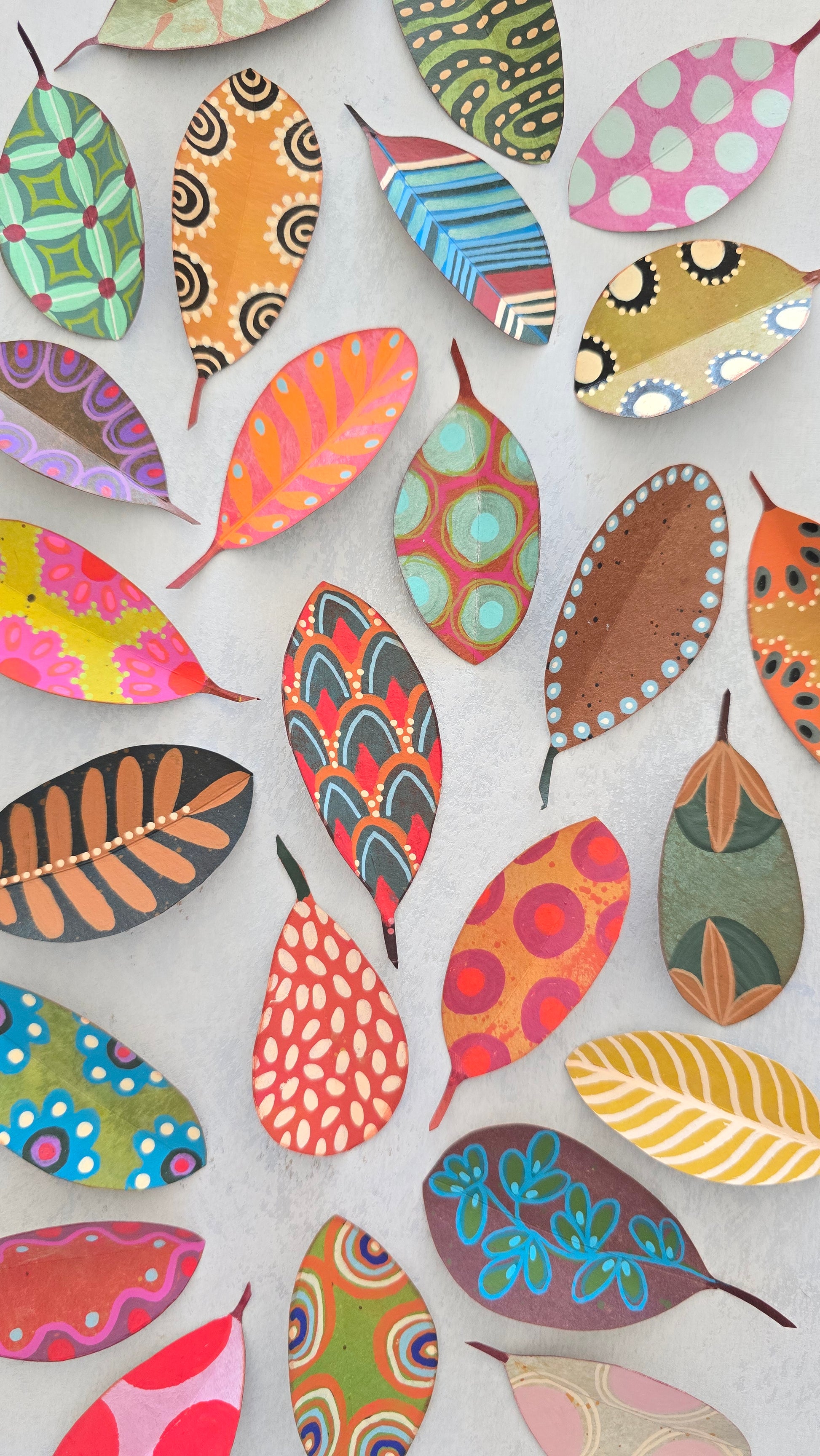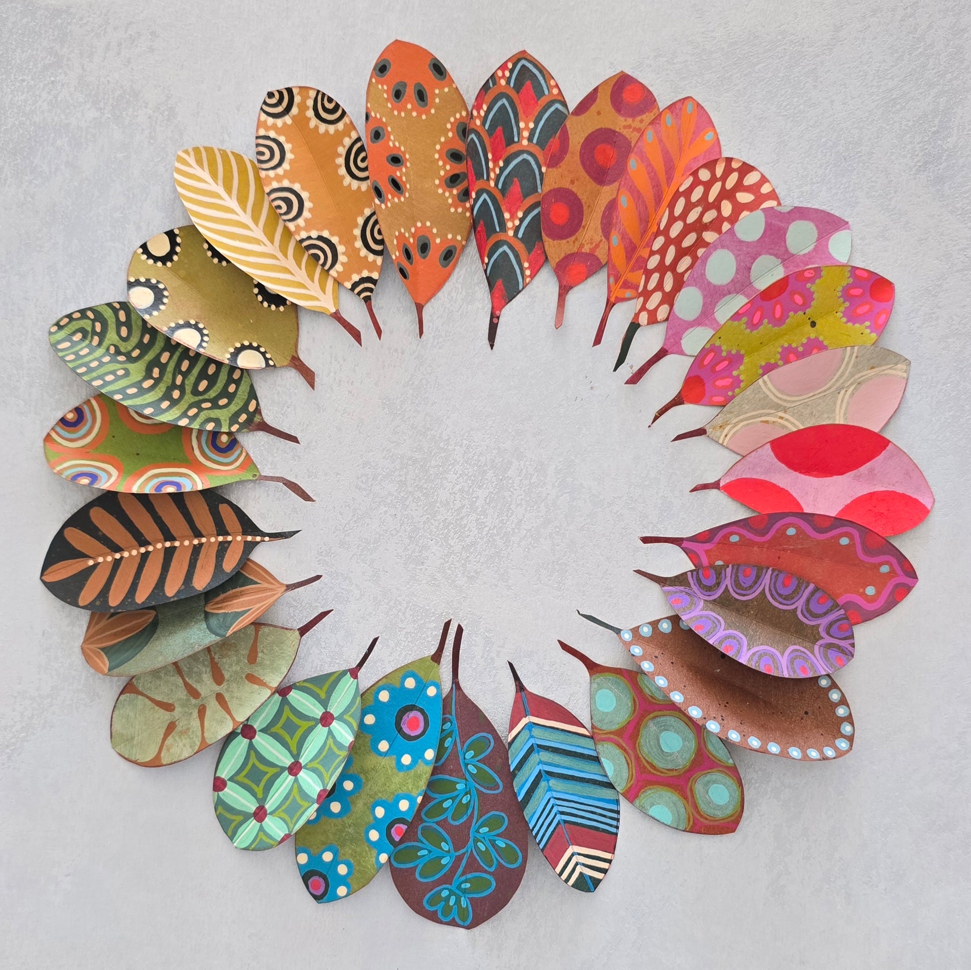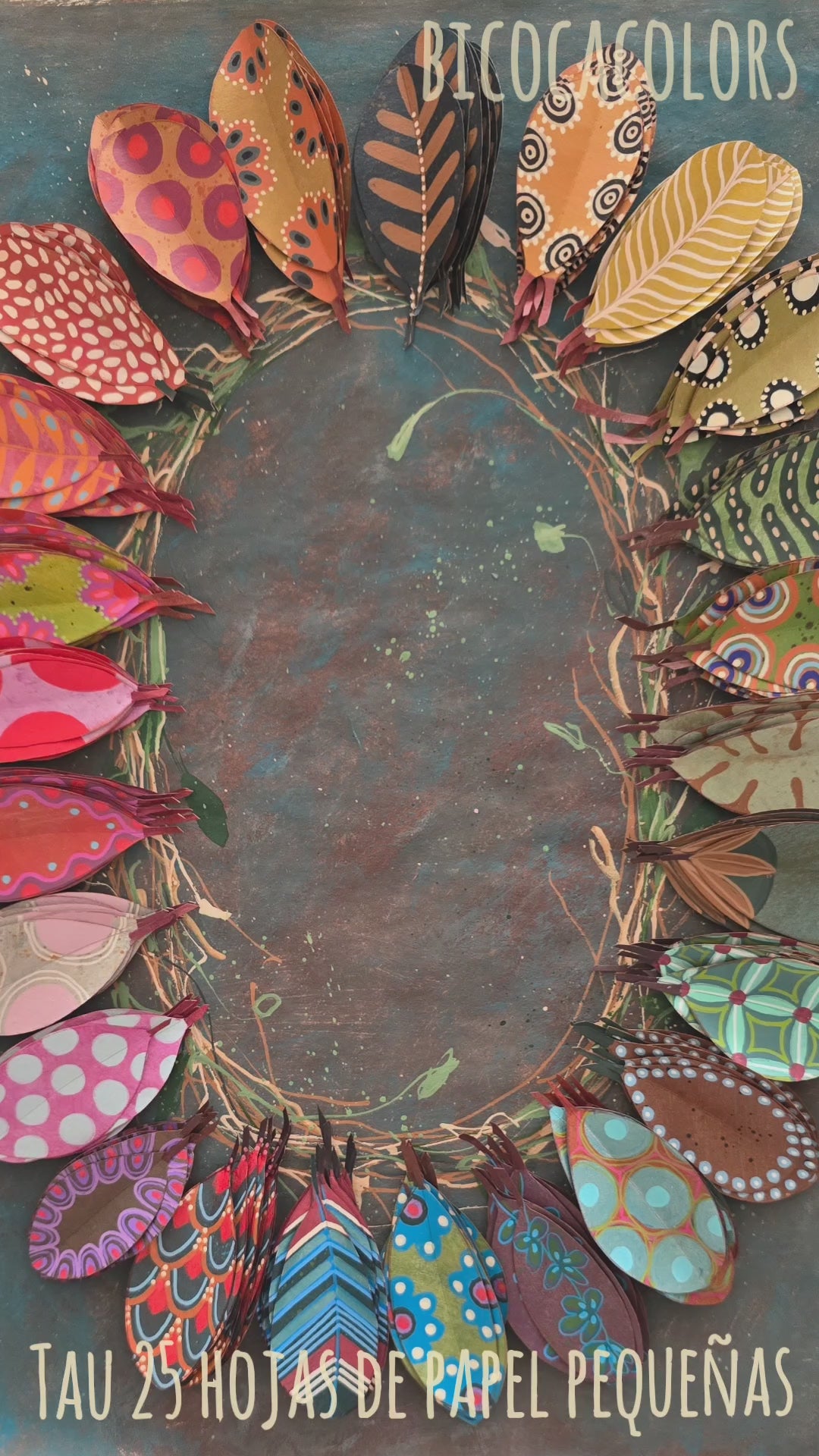 Colección de 25 hojas de papel kraft recortadas y decoradas a mano con ricos estampados y texturas multicolores inspirados en el arte aborigen, son frágiles y delicadas por su pequeño tamaño entre 4 y 6 cm.