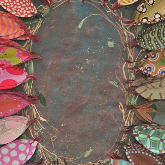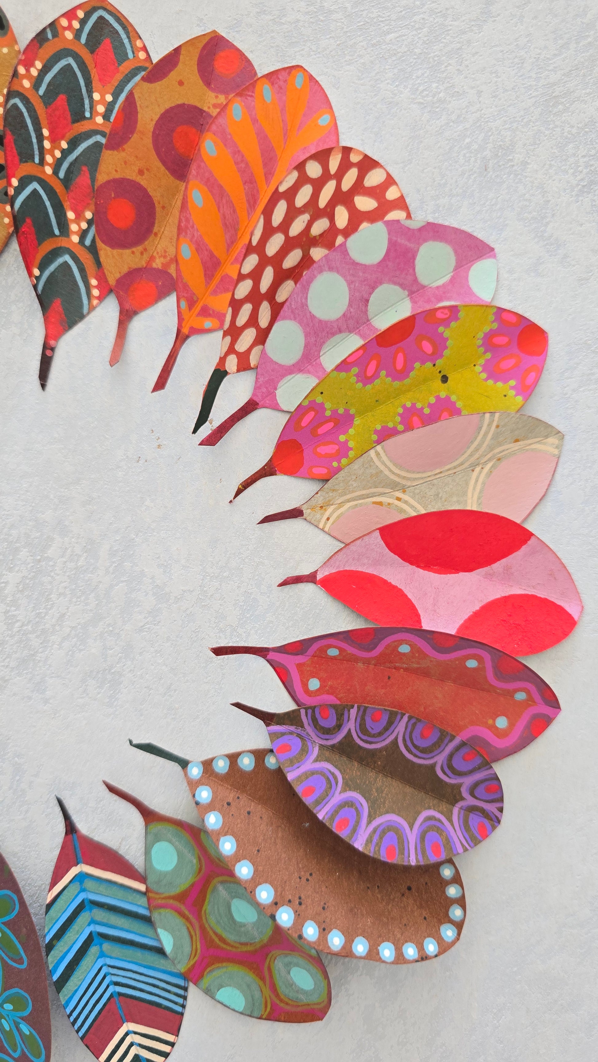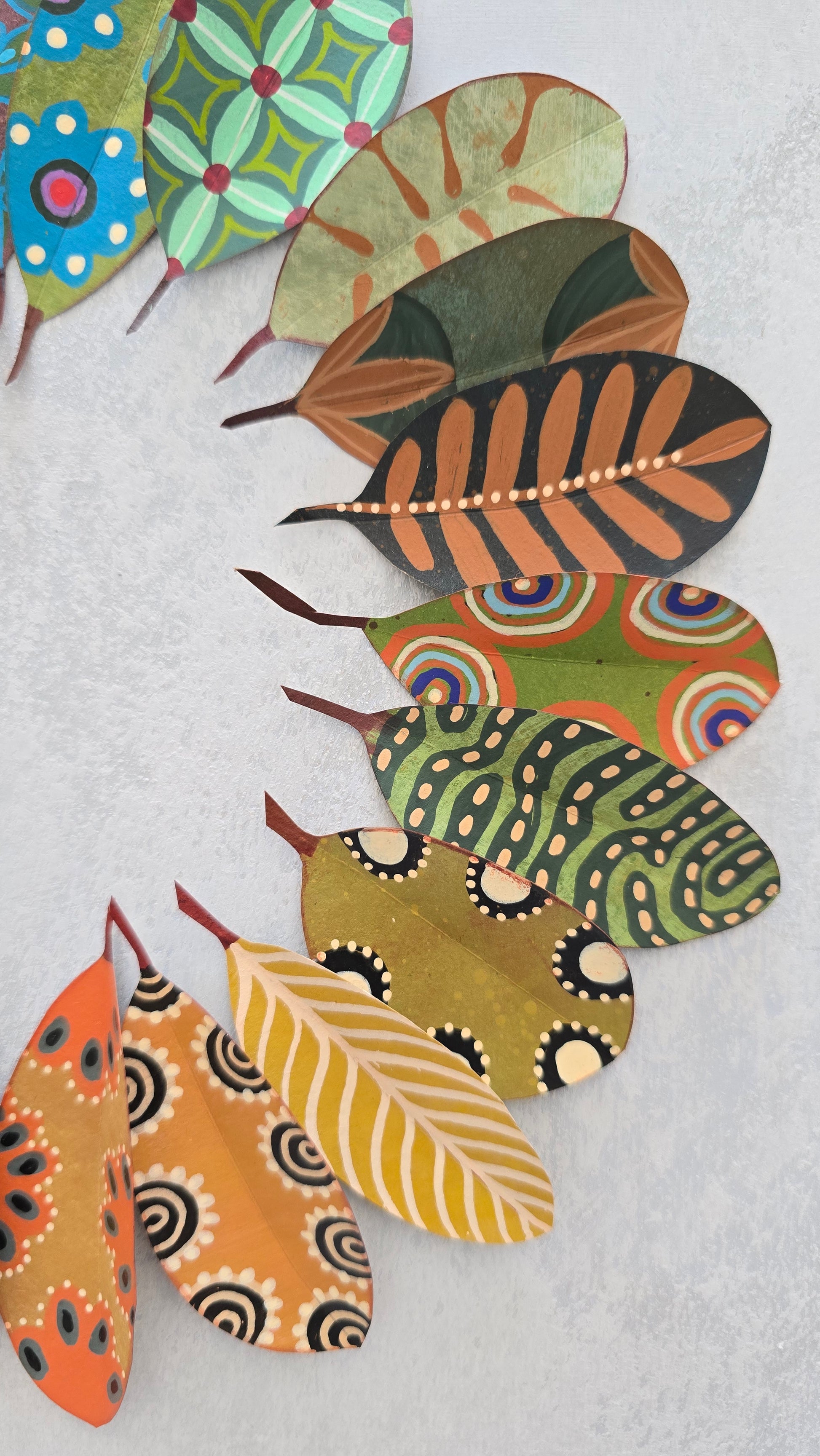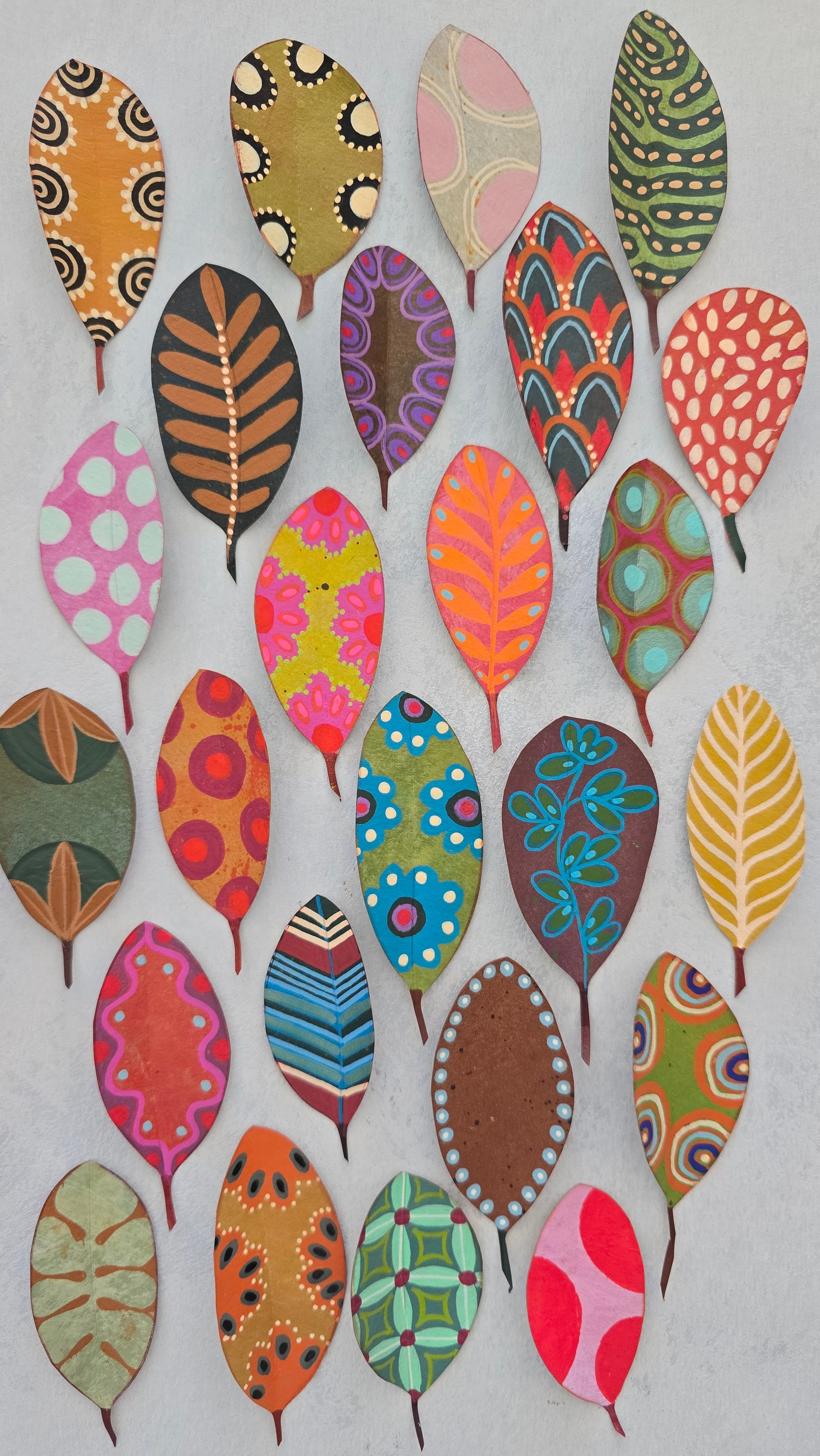 Colección de 25 hojas de papel kraft recortadas y decoradas a mano con ricos estampados y texturas multicolores inspirados en el arte aborigen, son frágiles y delicadas por su pequeño tamaño entre 4 y 6 cm.
